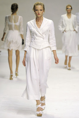 Dolce & Gabbana got all virginal for their latest collection, opening it up with a bunch of white lacey undergarment-inspired looks and then slowly morphing into temptress looks of black and leopard. It's all about a relaxed and sensual elegance based on the typical trousseau of Southern Italy. We love the tailoring and the use of bed linens and tablecloths, as well as extra light linens and crochet. They styling has a quiet elegance as well; the looks were perfectly paired with sandals, macramé flowers and gorgeous necklaces. All in all, a sweetly romantic and sensual collection that surprised us with its sense of tradition.